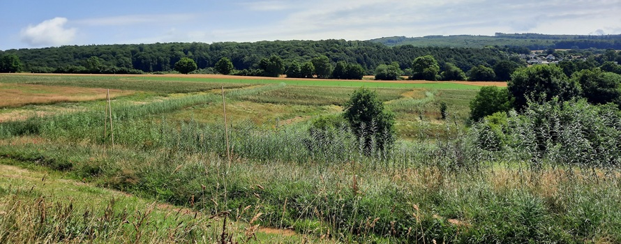 Kernziel 1: Agroforst als Lösungsansatz für den Wasserrückhalt in der Landschaft: Gehölzpflanzungen und hangparallele Sickergräben halten das Wasser in der Fläche. Das hilft bei Starkregenereignissen und durch die gesteigerte Versickerung steht den Kulturen auch in Dürreperioden mehr Wasser zur Verfügung.